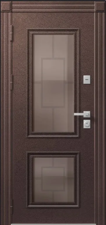 В конструкции двери Т-1 PREMIUM используется двухкамерный стеклопакет толщиной 48 мм, цвет Бронза с низкоэмиссионным энергосберегающим покрытием, сохраняющим тепло внутри дома. С внешней части стеклопакета установлена декоративная металлическая решетка. Эта дверь станет украшением Вашего дома